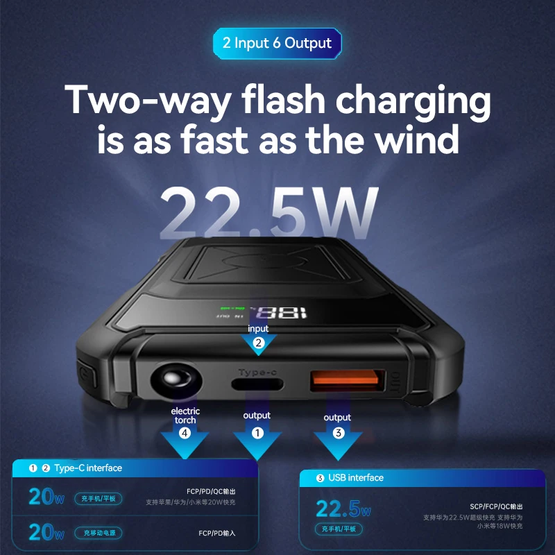 Output: Type C: 20W FCP/PD/QC USB A: 22.5W SCP/FCP/QC Super Fast Charge